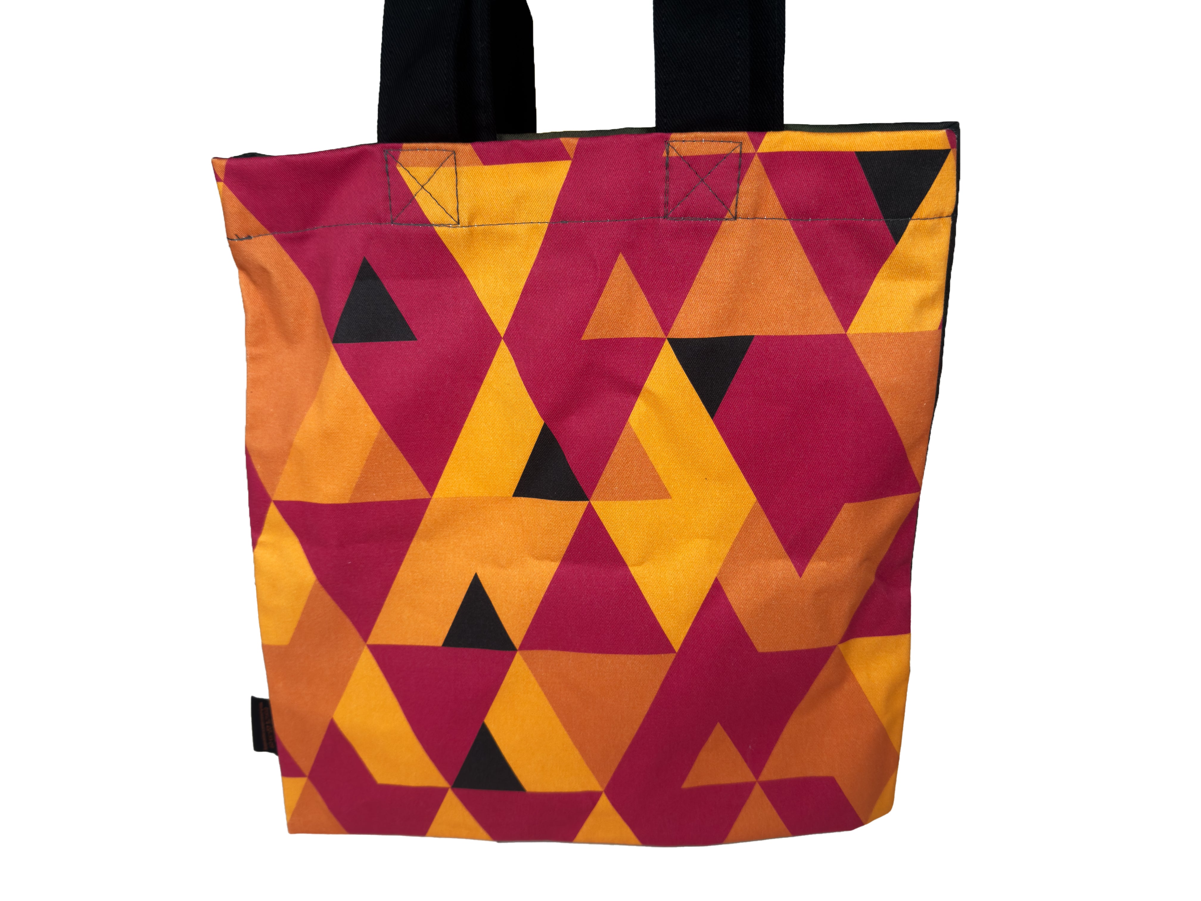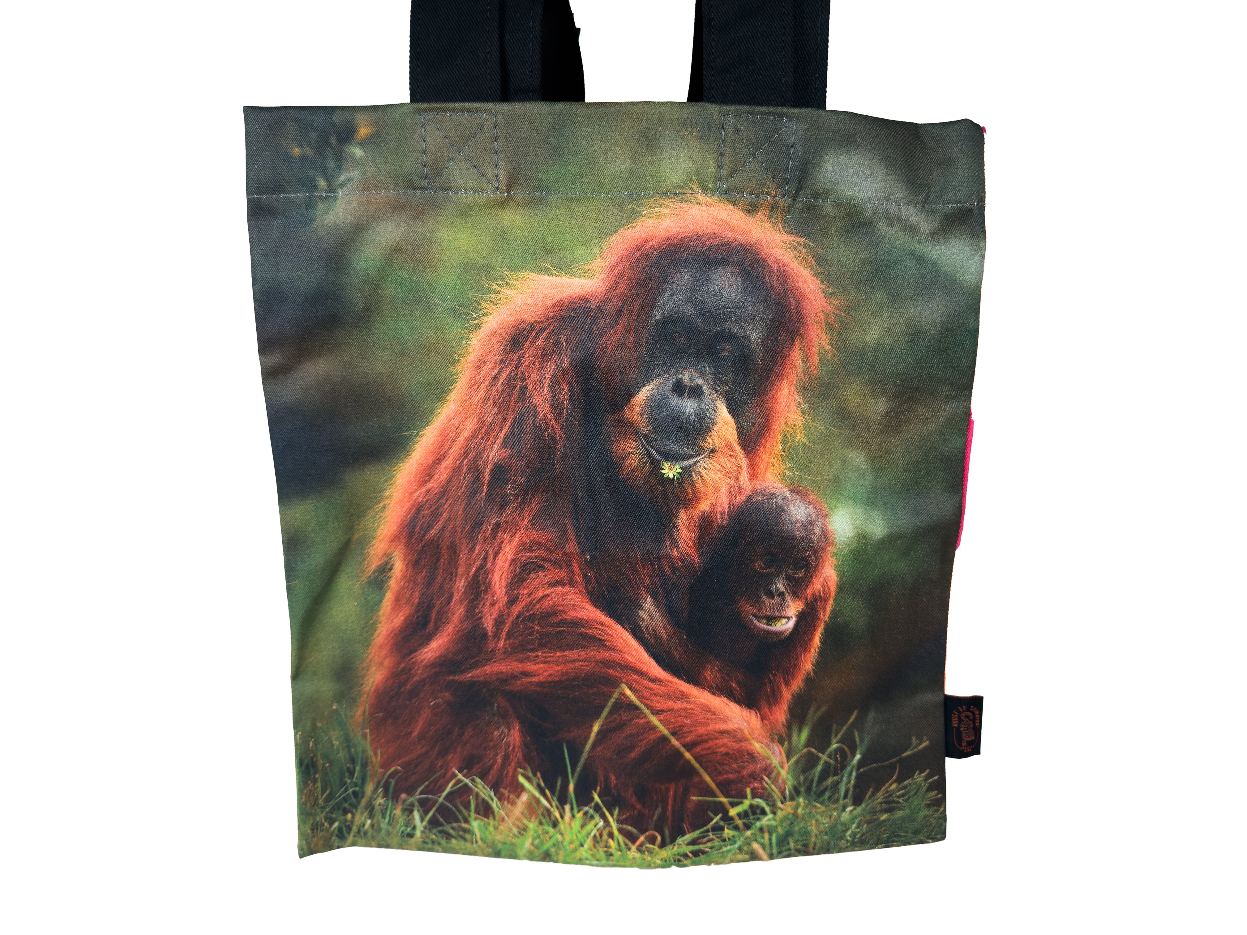 Carry your essentials in style with this striking House of Sumatra Orangutan Tote Bag. Crafted from 100% cotton, this durable two-sided design features a magnificent Orangutan on one side, complemented by striking red and orange triangles that add artistic depth on the other.