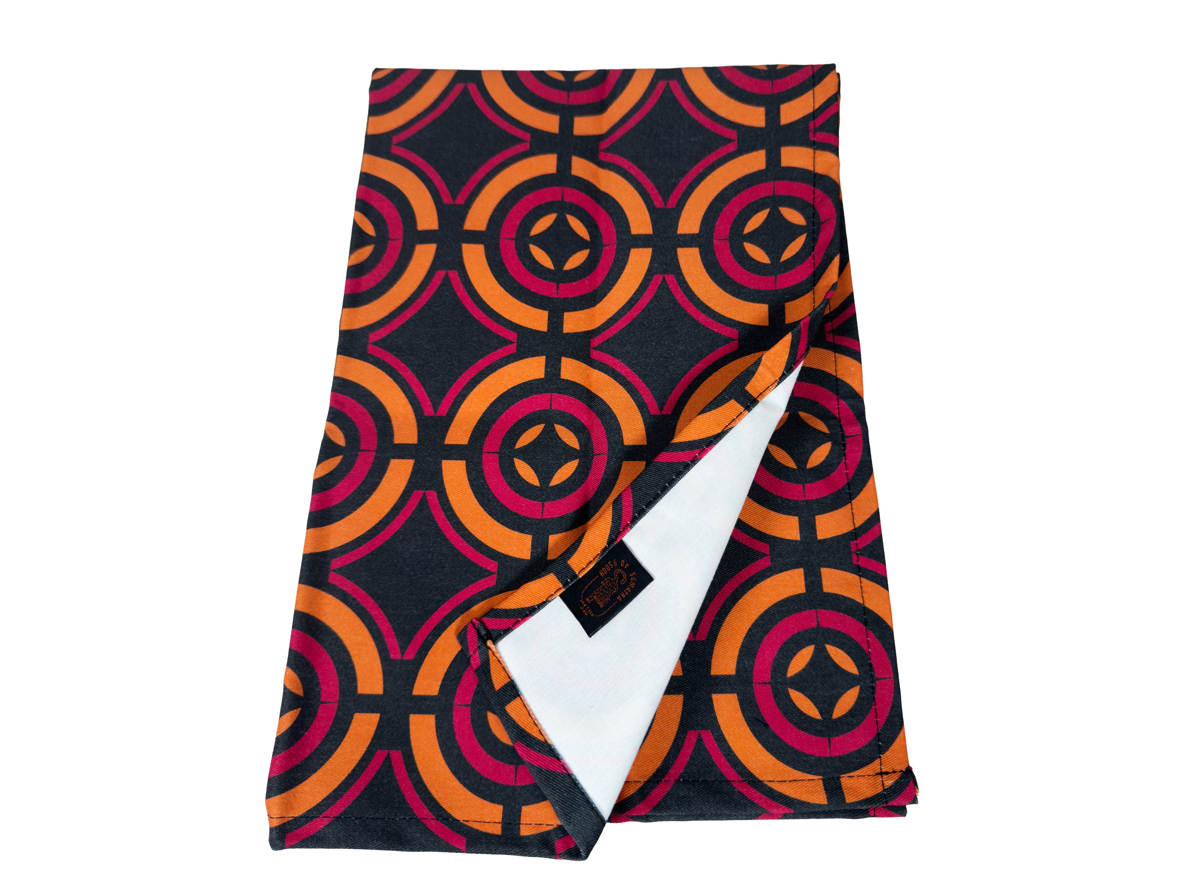 Elevate your kitchen with this striking House of Sumatra tea towel, featuring a captivating circular pattern in warm red and orange tones. Crafted from 100% cotton, this versatile piece combines aesthetic appeal with practical functionality.