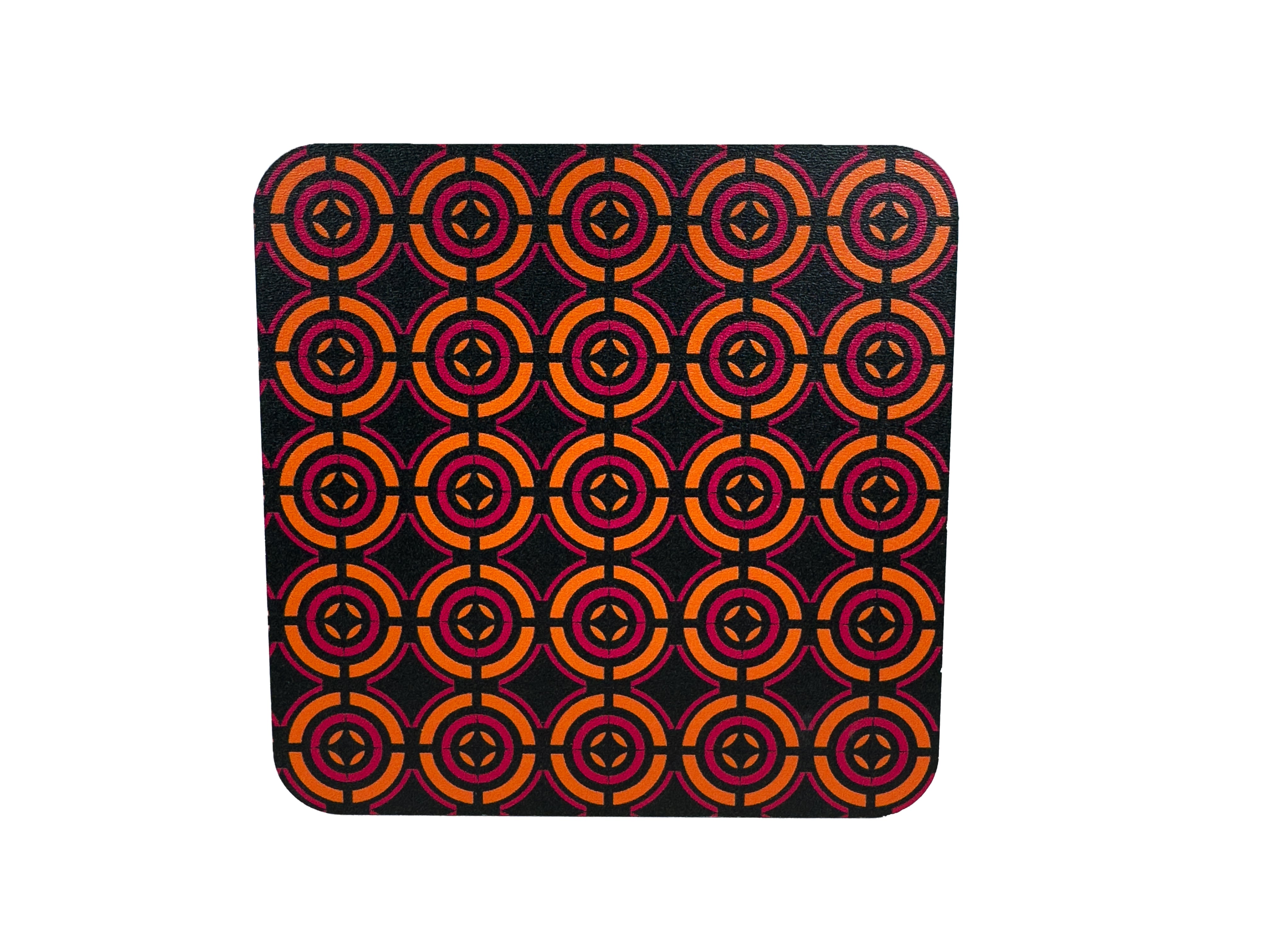 Elevate your tabletop with this striking House of Sumatra coaster, featuring a bold geometric circles pattern in vibrant orange, red, and black.