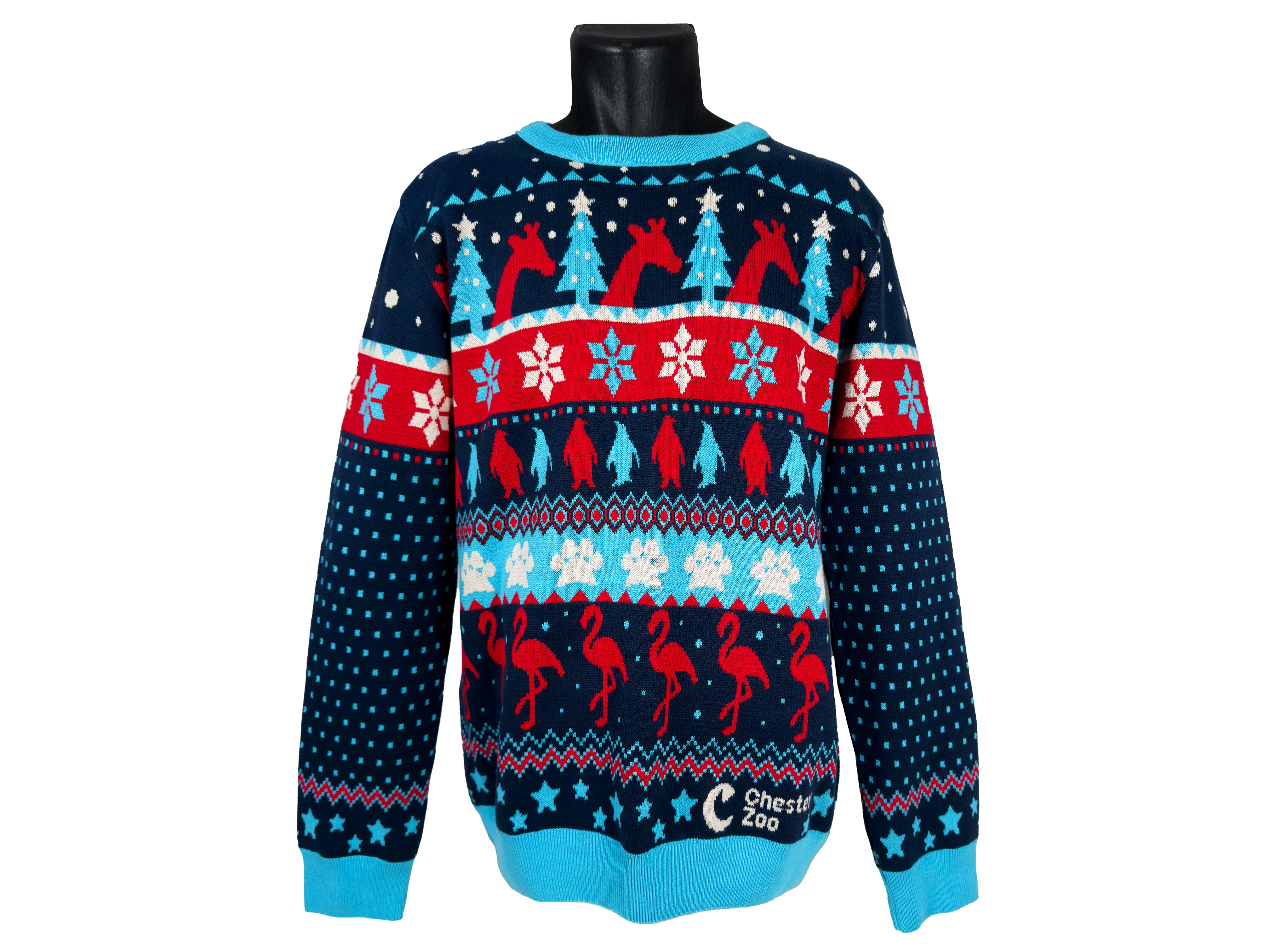Celebrate the festive season with our exclusive Chester Zoo Christmas jumper. Featuring beloved animals including penguins, giraffes, and flamingos, this jumper blends holiday spirit with wildlife appreciation.